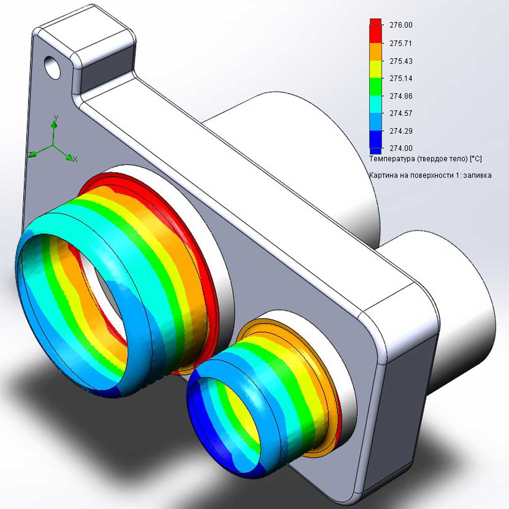 Автор в свое время выполнил большую серию экспериментов с моделированием в САПР процесса нагрева сварочных насадок. Для того чтобы в статическом режиме получить на рабочих поверхностях насадки среднюю температуру 260°C, на нагревателе требуется назначить температуру от 265 до 280°C, в зависимости от прочих настроек компьютерной симуляции: