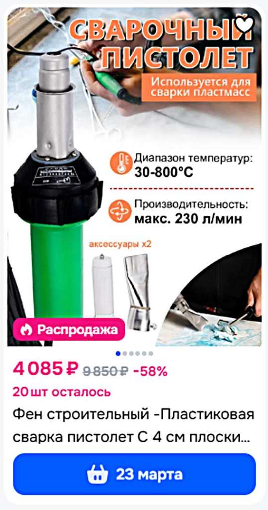 ВСЁ! Остается в карточке товара на маркетплейсе прописать привлекательные характеристики и сказочное описание, приложить заманчивые картинки из фотошопа - и успех гарантирован! Более того, если хорошо упаковать и доставить в срок, такой товар соберет положительные отзывы, поскольку в первые несколько недель будет успешно включаться и даже греть воздух. И кажется, что так будет всегда! Ну чем не подарок за 4 тыс.руб? А если это «счастье» не способно выполнить нормативные требования к сварочным параметрам, то кто ж это заметит?